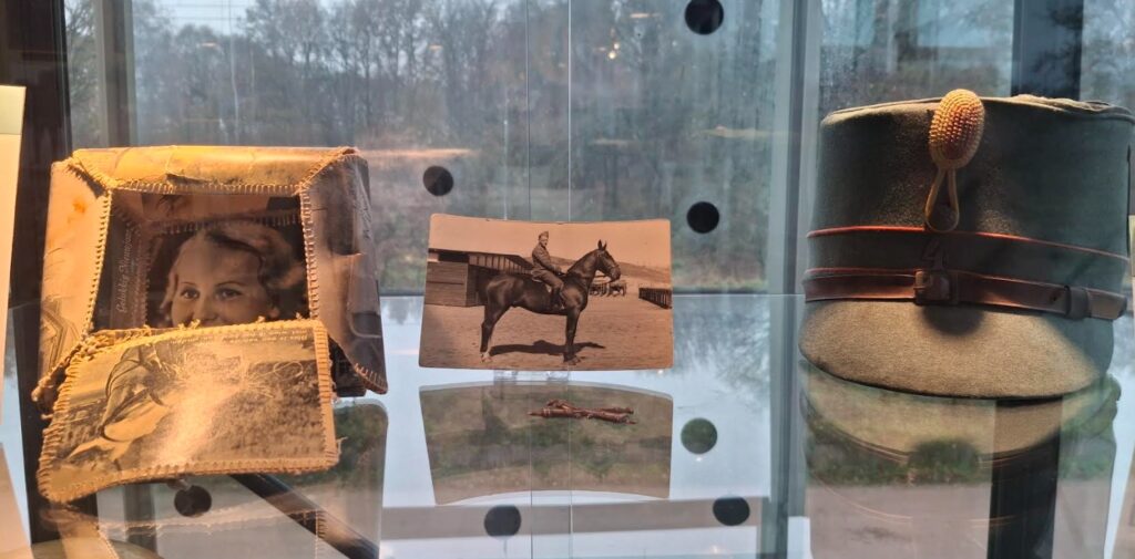 Op de bovenste vitrineplaat ligt de kepi van dienstplichtig militair Dikker. Hij was actief als verkenner bij I-4 R.A. De kepi heeft een rode bies (artillerie) en toont het regimentsnummer. Zijn verloofde maakte een doosje van haar foto en de ansichtkaarten die hij stuurde.