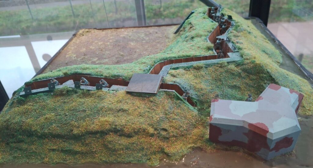 Op de bodemplaat ligt een maquette van een stelling in de Grebbelinie bij Veenendaal. De militairen zijn enigszins beschermd door loopgraven en loopgraafschilden. Rechts is een loopgraafschild te zien dat op de borstwering van de loopgraaf werd geplaatst.