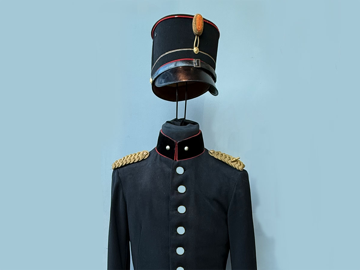 Het uniform zelf is een uitgaans- of parade-uitvoering. De donkere stof met rode biezen en de verzorgde schouderafwerking verwijzen naar de militaire representatie: zo trad men naar buiten bij officiële gelegenheden.
